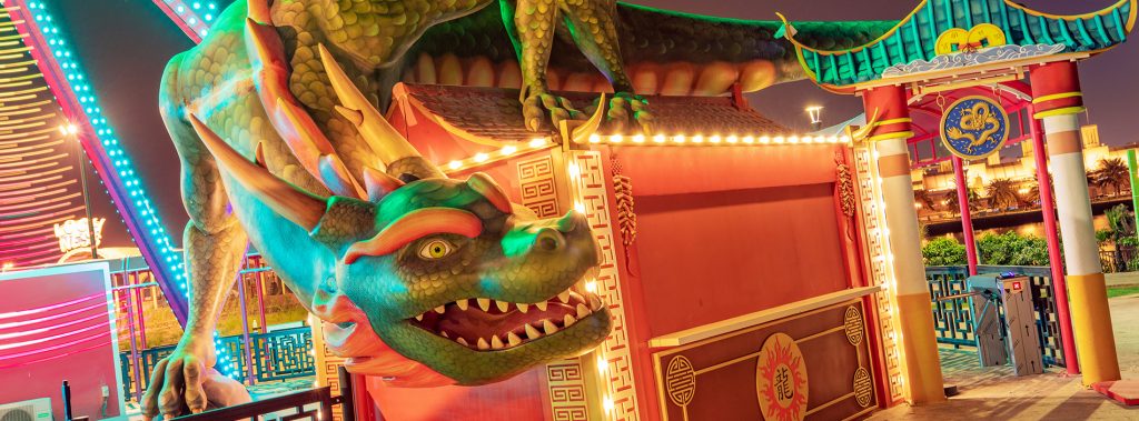 - لعبة التنين: إذا أراد زائر جزيرة الأساطير أن يصل إلى أعلى درجات التشويق والمتعة فإن عليه تجربة لعبة التنين المميزة، والتي تبتدئ بمُقابلته للتنين الصيني قبل أن يتّجه في رحلته الجويّة الخيالية، وهي بمثابة اختبارٍ للشجاعة.